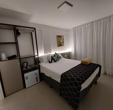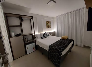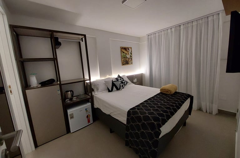 Equipada com uma confortável cama de casal e uma cama auxiliar individual, a Suíte 01 acomoda com facilidade casais ou pequenos núcleos familiares. O ambiente conta com ar-condicionado, Smart TV 32”, espelho de corpo inteiro, iluminação em LED, luz de leitura, armário de apoio, além de secador de cabelo e passadeira de roupas – tudo para que você se sinta em casa, mesmo longe dela.