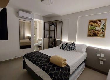 Suíte 01 – Conforto com vista para a piscina, ideal para casais e famílias