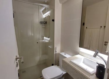 O banheiro possui chuveiro com água quente, garantindo banhos relaxantes após um dia de diversão ou descanso.