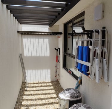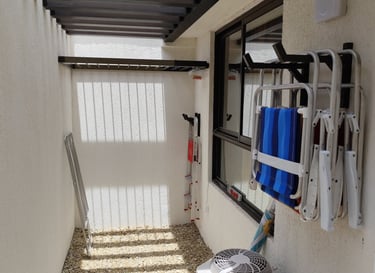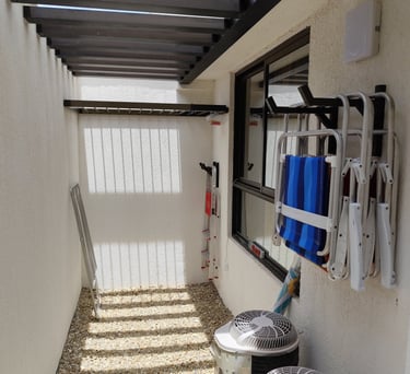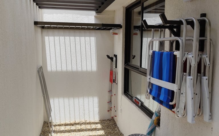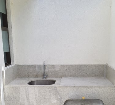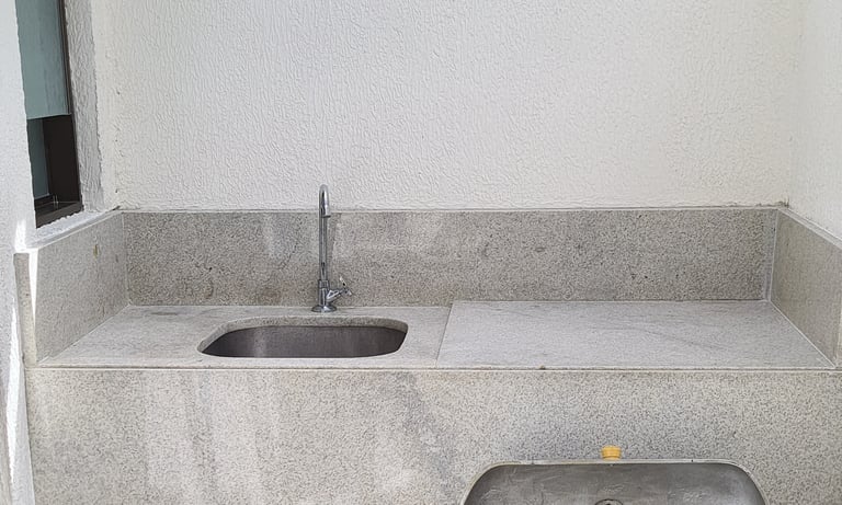 A área de serviço complementa a praticidade do apartamento, com uma bancada de mármore com lavador, espaço para apoio de cadeiras de praia e escada, e um ótimo varal – ideal para secar as roupas com toda comodidade durante a estadia.