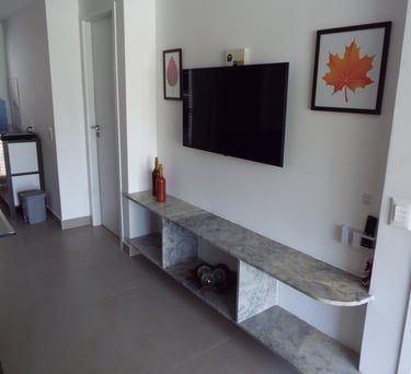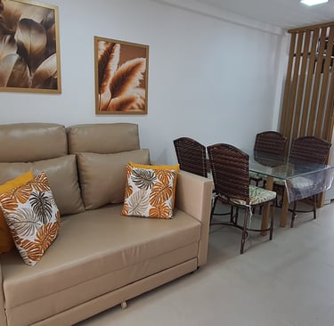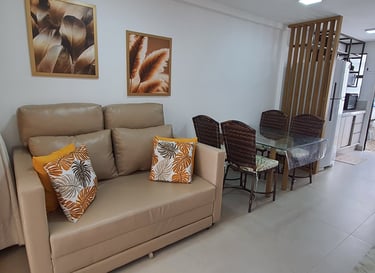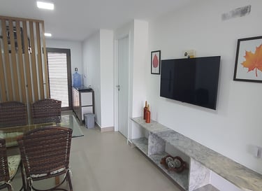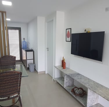 Nossa charmosa sala de estar foi projetada para oferecer conforto e praticidade, seja para relaxar após um dia de passeios ou para curtir momentos em família. Equipada com um confortável sofá, Smart TV 43”, mesa de jantar com 4 cadeiras e apoio em mármore, o ambiente oferece tudo que você precisa para se sentir em casa. Uma elegante cortina garante privacidade sempre que desejar.