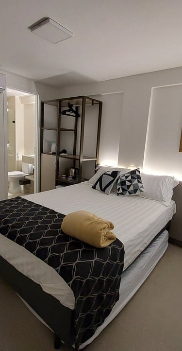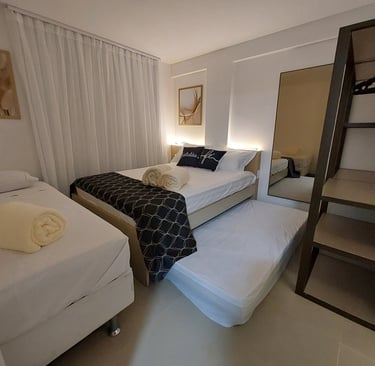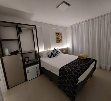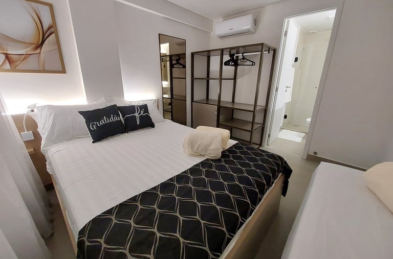 Acomodações incluem uma confortável cama de casal, uma cama de solteiro e uma cama auxiliar individual, todas preparadas para garantir uma ótima noite de descanso. O ambiente é climatizado com ar-condicionado, proporcionando conforto em qualquer estação do ano.
