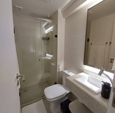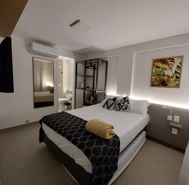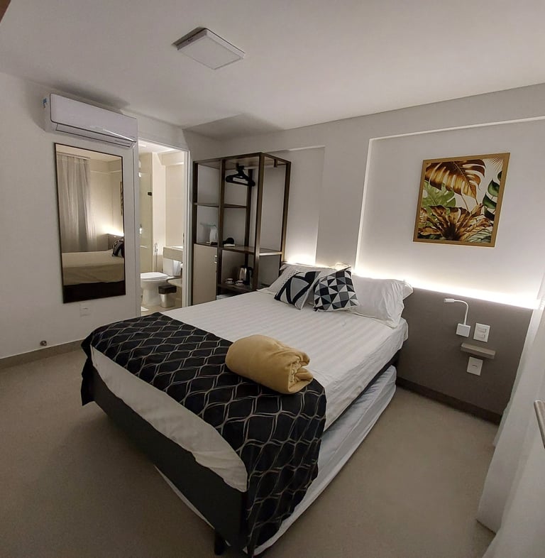 Para maior comodidade, a suíte também conta com espelho de corpo inteiro, iluminação em LED, luz de leitura individual, armário de apoio e um banheiro equipado com chuveiro de água quente – ideal para relaxar após um dia de passeios e diversão.