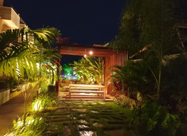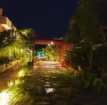Jardim cuidadosamente planejado, com paisagismo que valoriza a natureza local